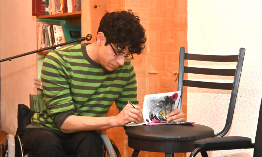 Lee un fragmento de su libro. Tiene tomado el micrófono y narra sobre la silla de ruedas que ha usado desde la infancia. Edgar Lacolz habla de su experiencia durante la pandemia de Covid-19. Su acento es cómico, a veces trágico. Cuenta que vivió la llegada del virus en Ciudad de México; la interminable urbe, al igual que el resto del mundo, enloqueció. Entonces fue momento de ir al teclado, de construir palabras que pudiesen servir de cura ante un enemigo invisible.