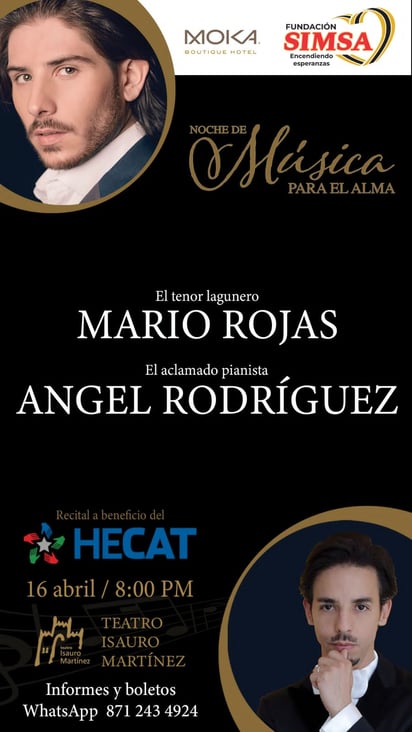 La Hermandad Educativa del Colegio Americano (HECAT) organiza un concierto benéfico con el tenor lagunero Mario Rojas y el pianista Ángel Rodríguez, además de la participación especial de la soprano japonesa Yurie Takano, el cual se llevará a cabo este jueves 16 de abril, en punto de las 20:00 horas, en el Teatro Isauro Martínez (TIM).