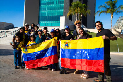 Alzan la bandera venezolana en medio del sol invernal que cae sobre…